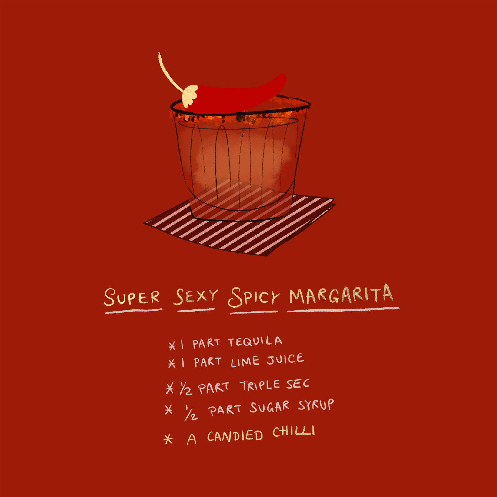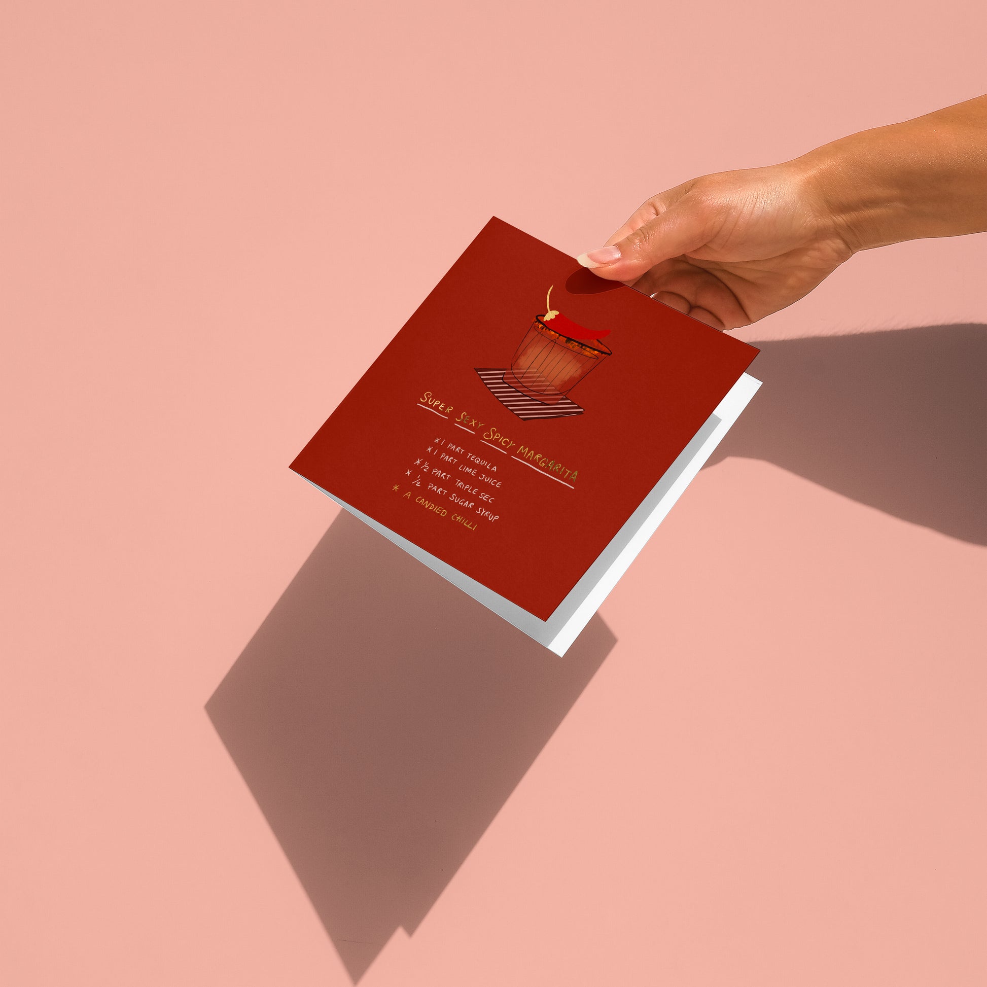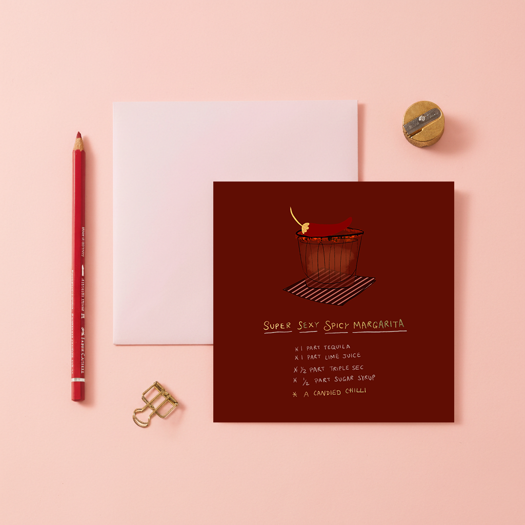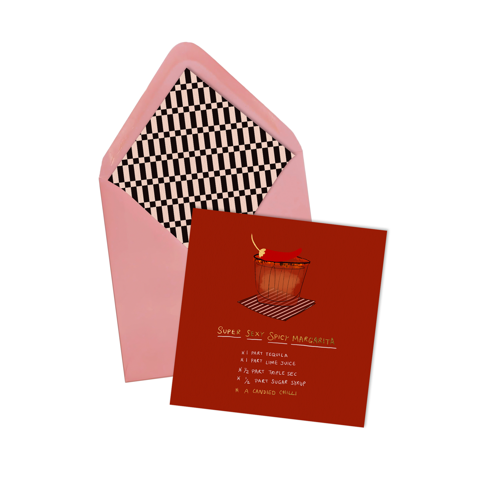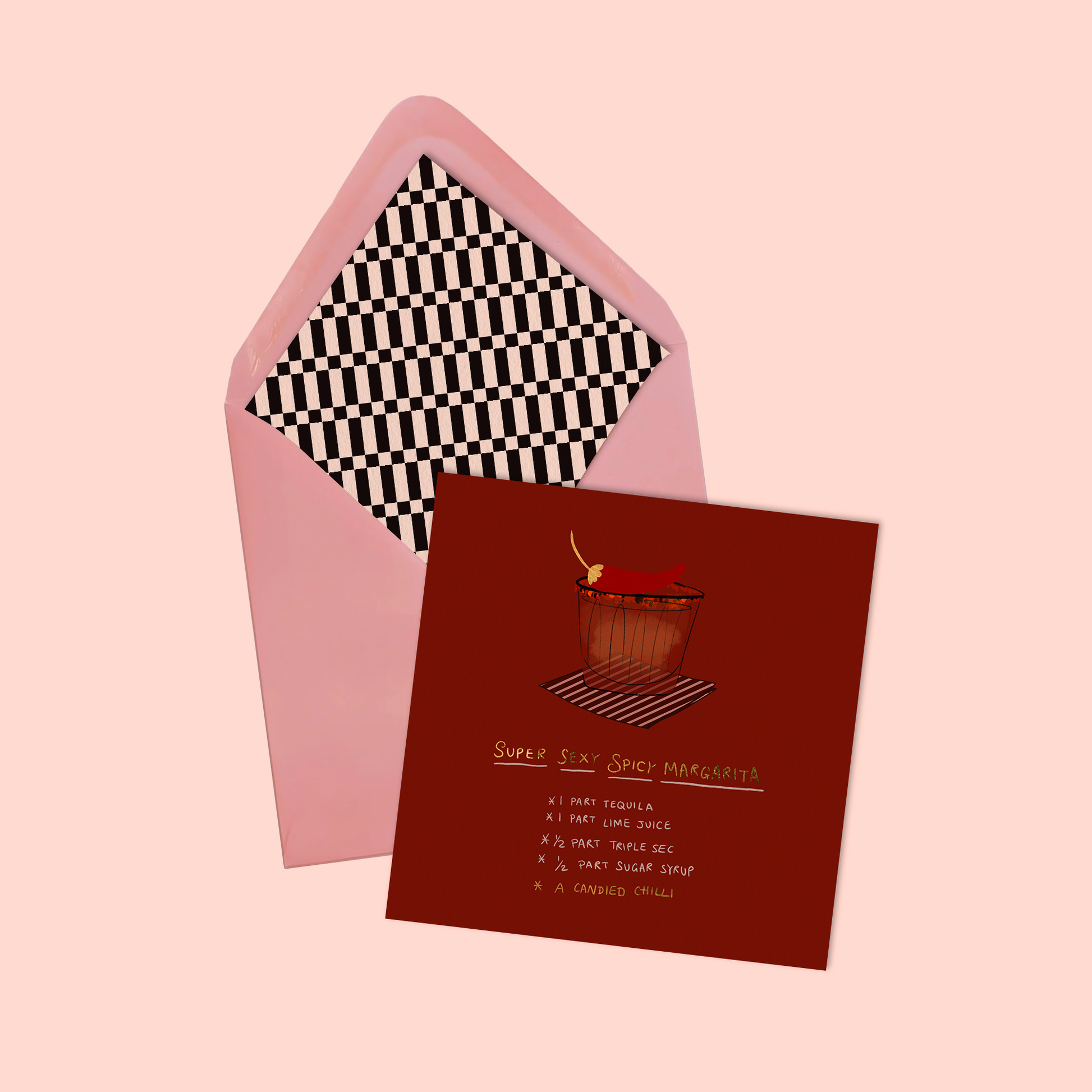 A greeting card featuring a spicy margarita recipe with a candied chili twist. Designed to keep, pin to the fridge, and revisit. Paired with a matching envelope and a geometric patterned insert.