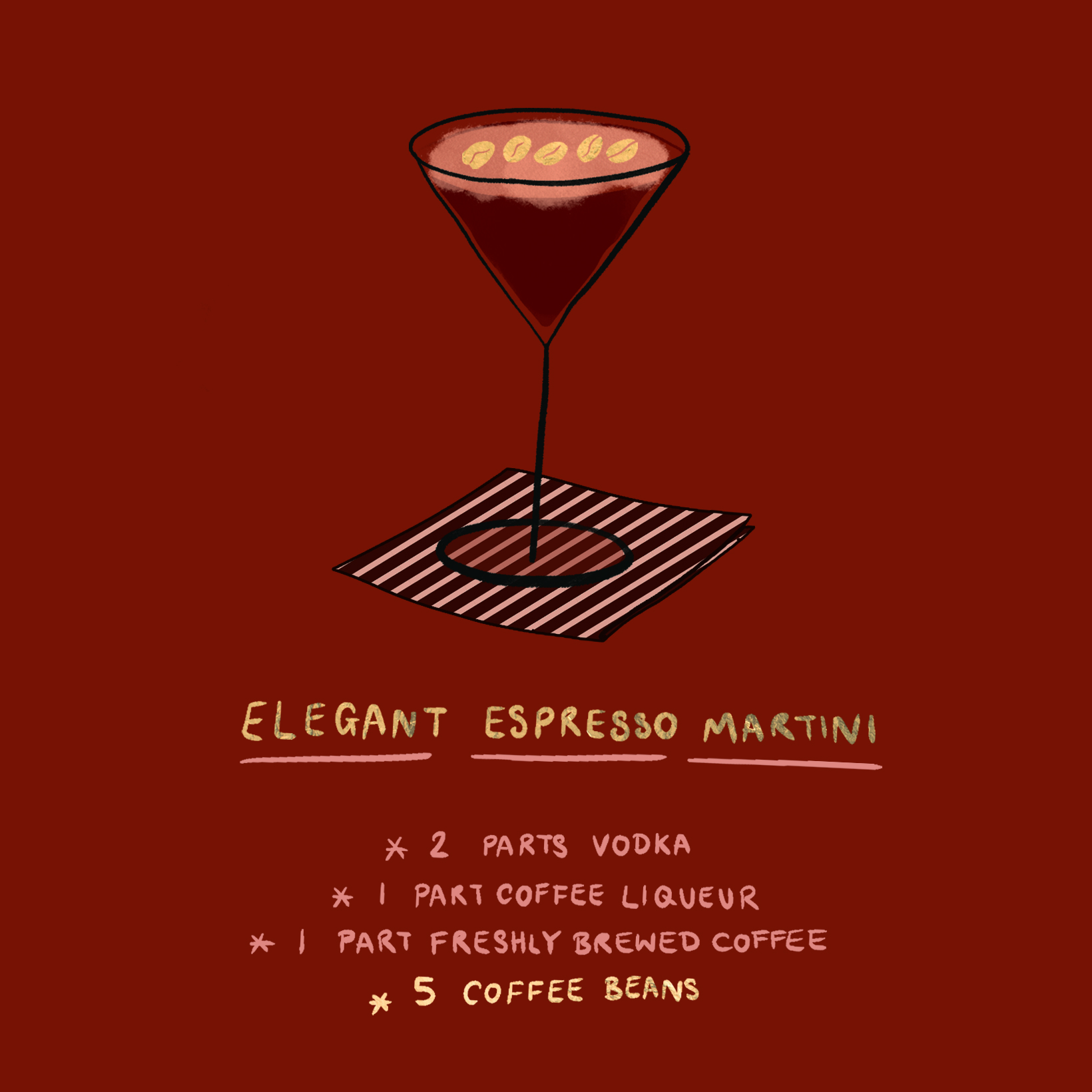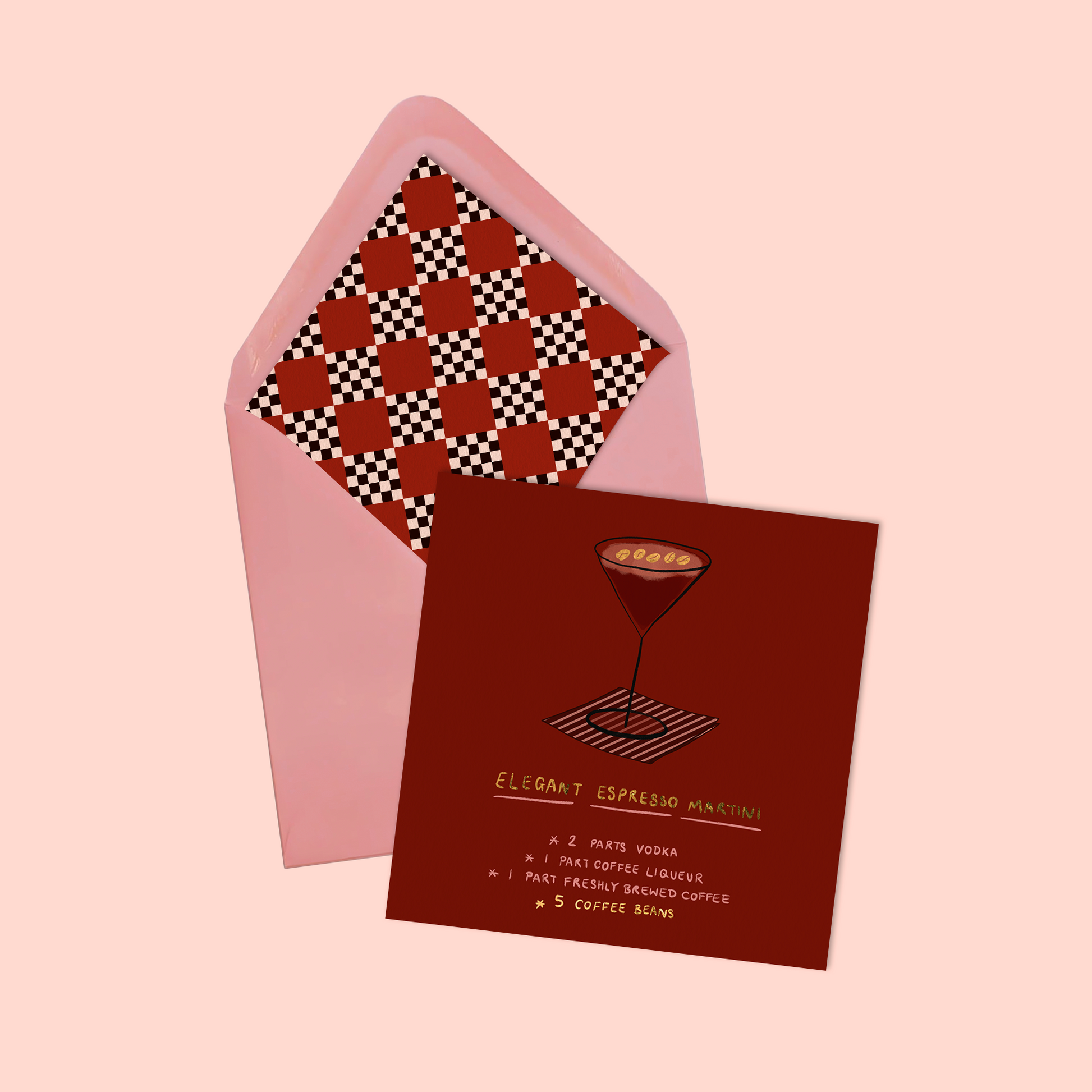 A chic greeting card featuring an espresso martini recipe, accented with five gold foiled coffee beans. Comes with a matching envelope and geometric patterned insert.