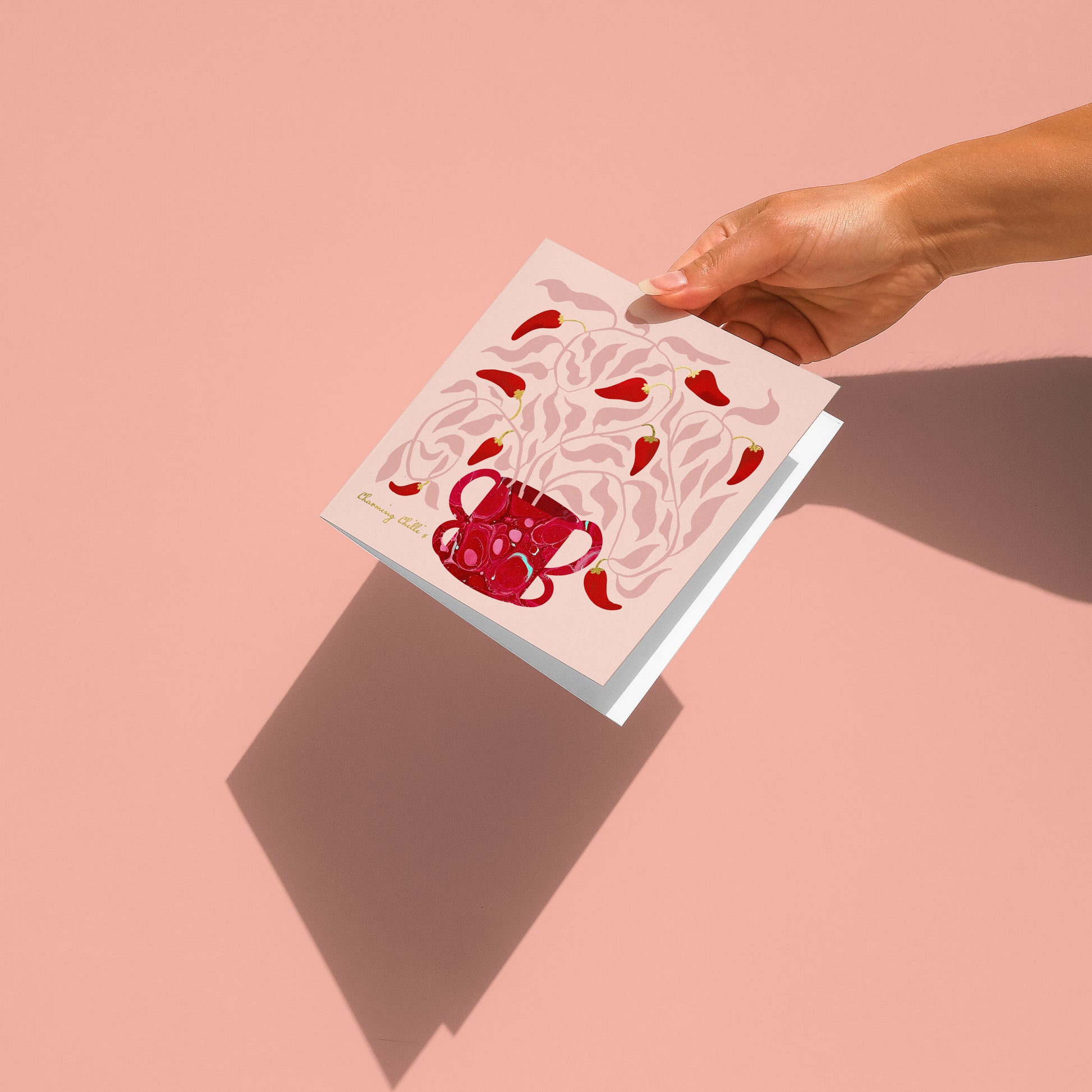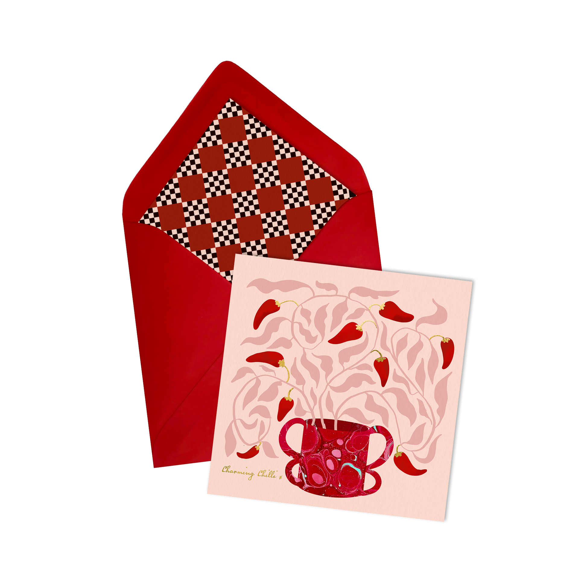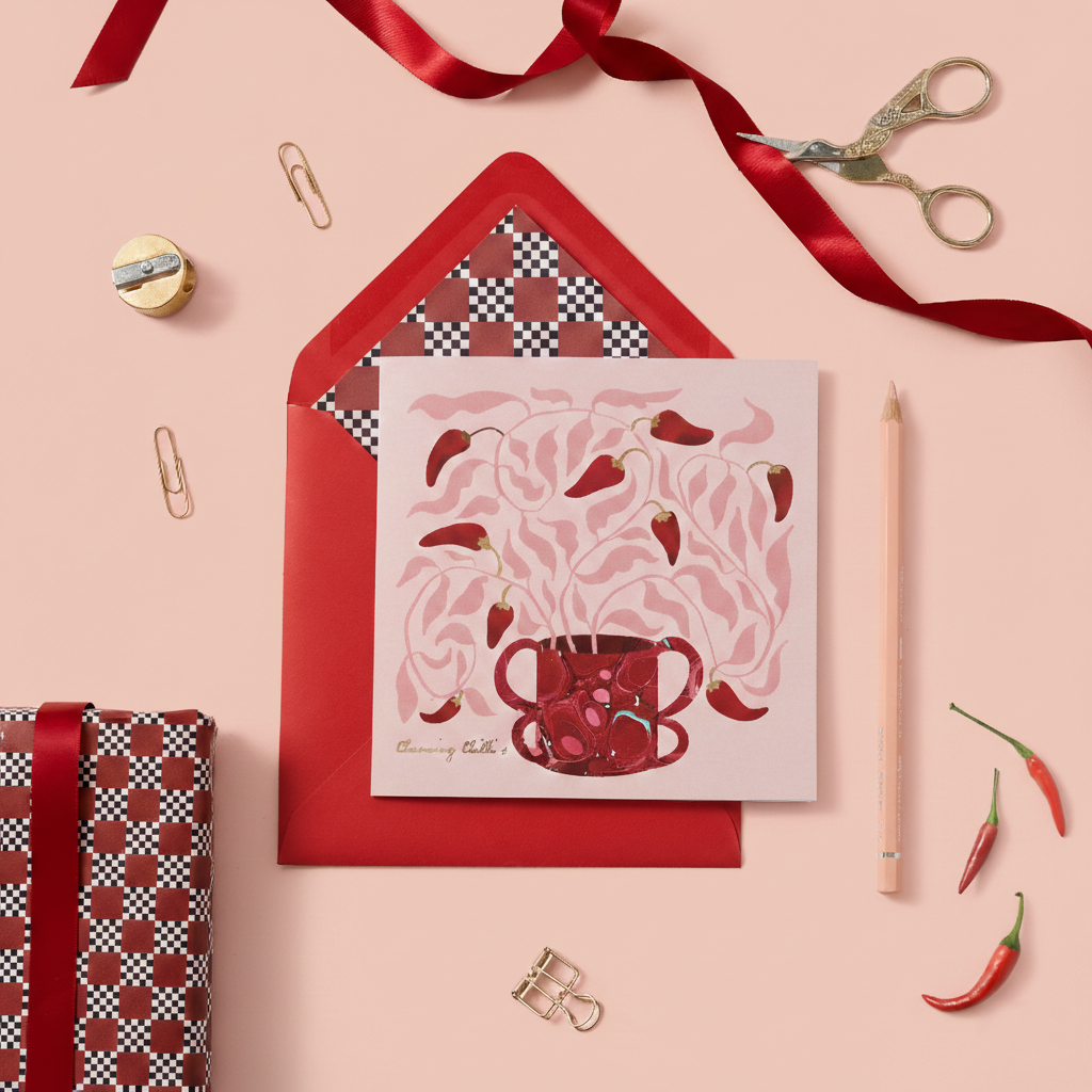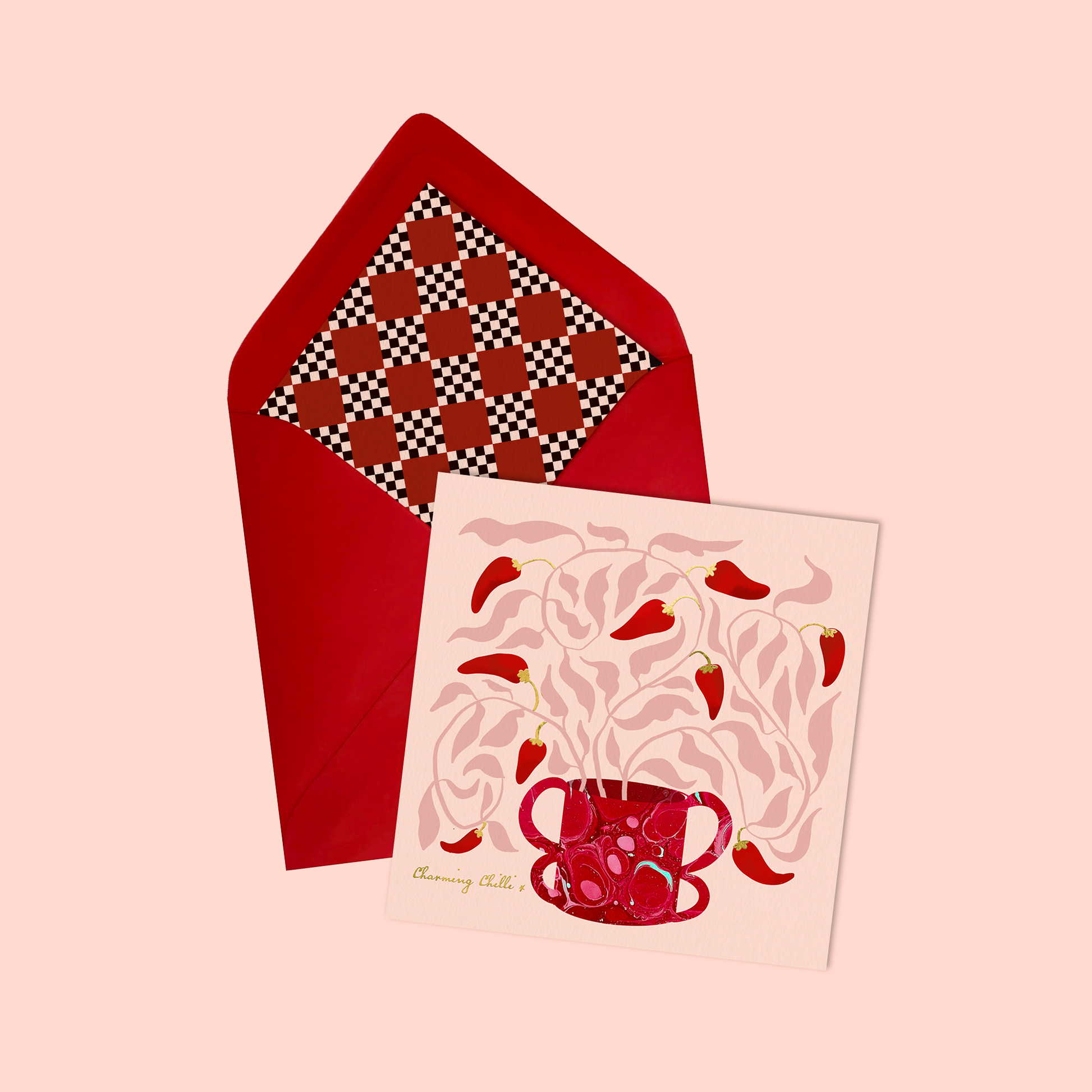 A greeting card featuring a vibrant chilli plant in a marbled vase with gold foil accents. A spicy way to send well wishes. Paired with a coordinating envelope and a contemporary geometric patterned insert