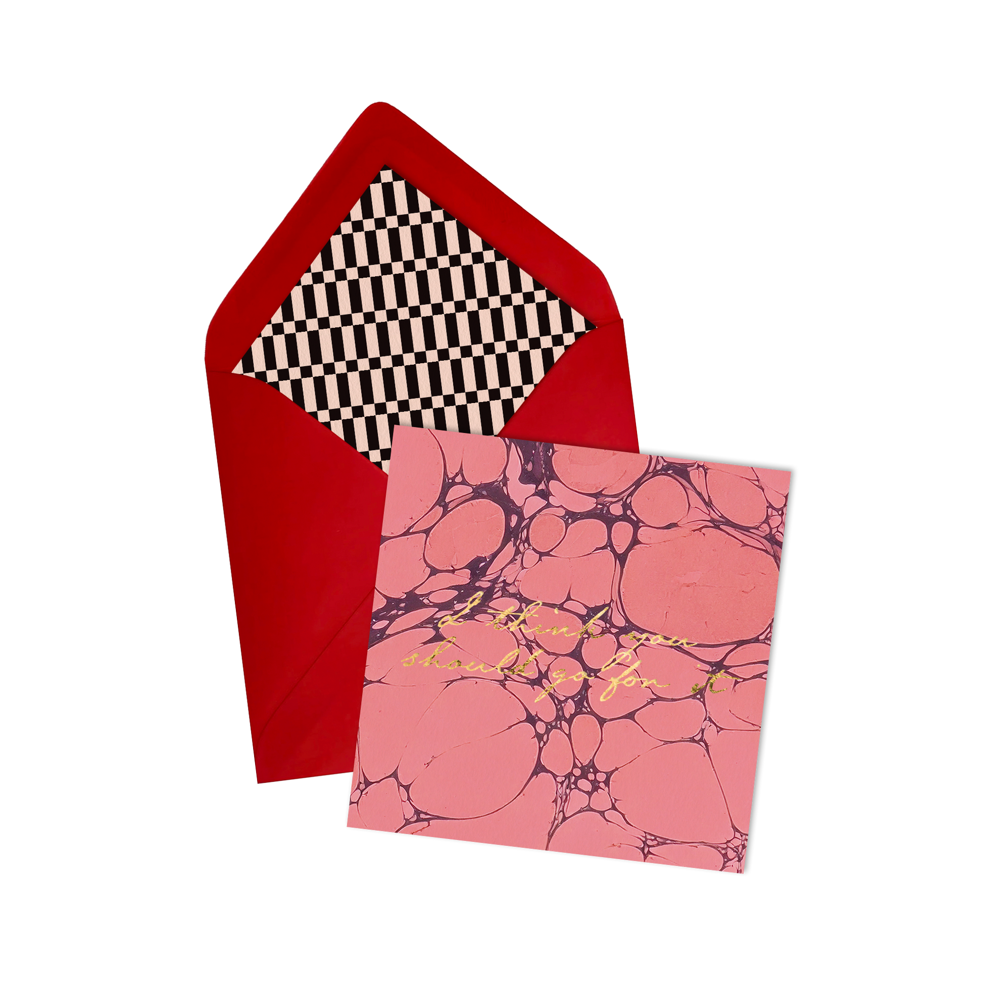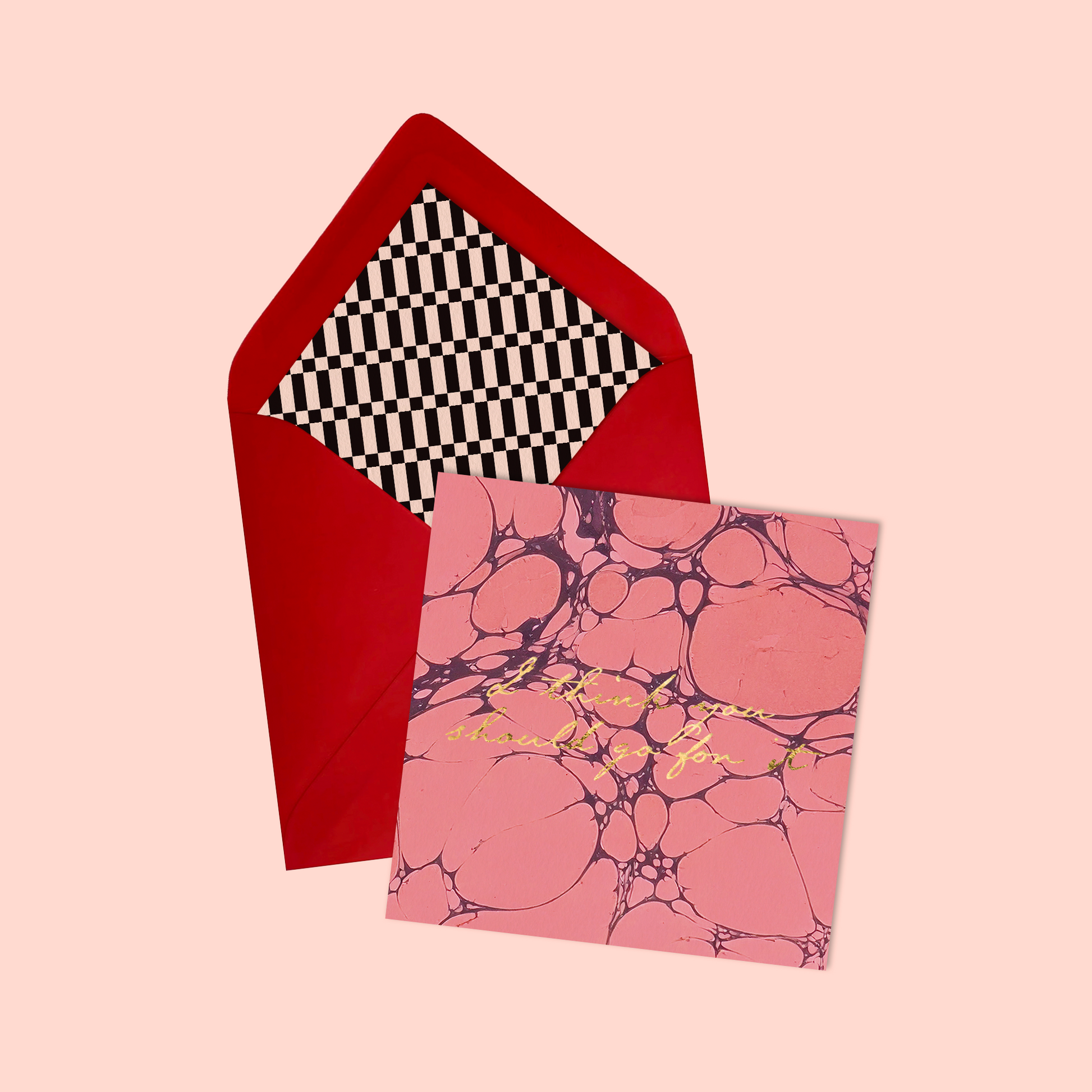A soft pink marbled card with bold gold foil lettering, encouraging someone to take the leap and follow their dreams. Comes with a coordinating envelope and a stylish geometric patterned insert.