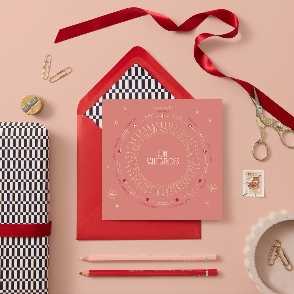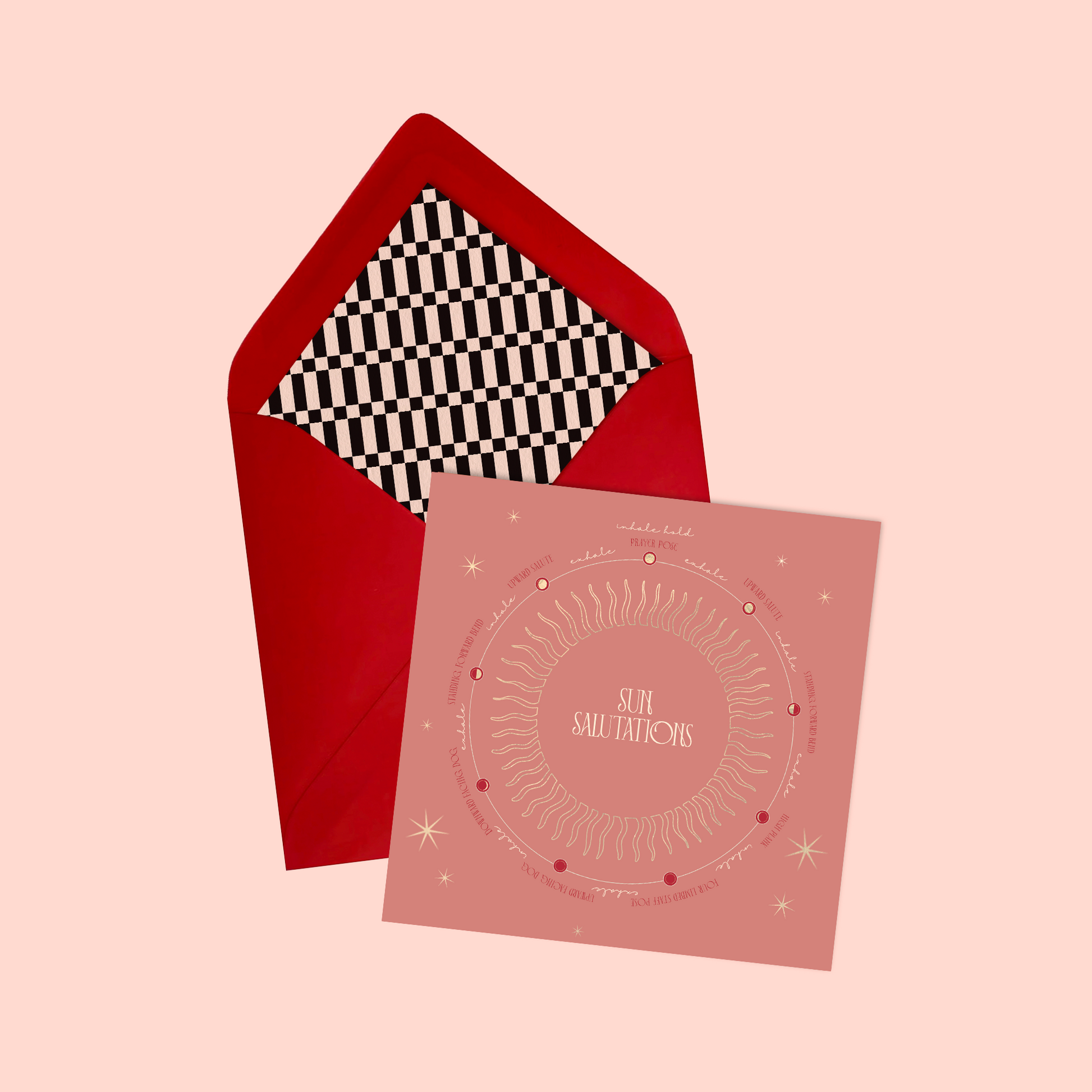 A card illustrating the sun salutations yoga cycle with gold foil sun and stars. Paired with a coordinating envelope and a geometric patterned insert.